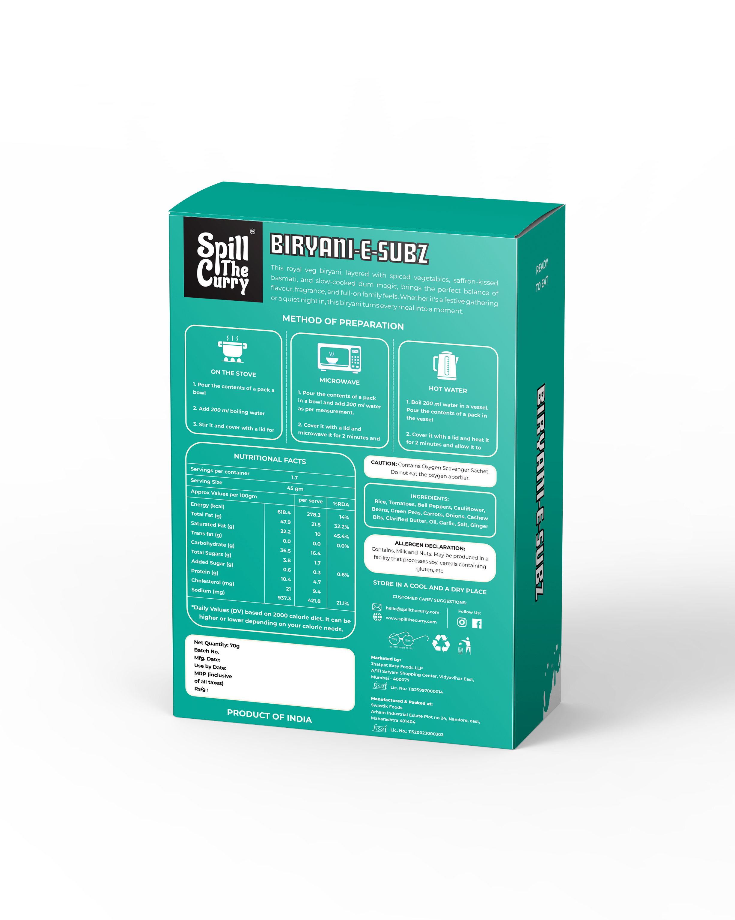 Fragrant basmati rice cooked with whole spices, caramelized onions, and aromatic herbs. A heat-friendly twist on India's beloved royal dish, perfect for lunchboxes or a quick weeknight dinner. Enjoy with raita or papad.